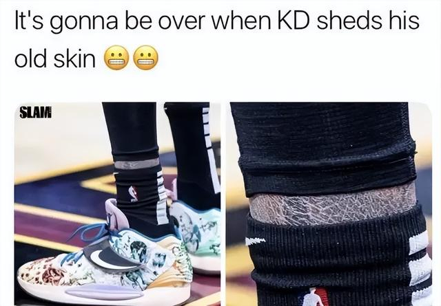 时间回到2021年1月,当时的杜兰特还在为布鲁克林篮网队打球,作为知名球鞋媒体的Slam Kicks上传了一张他亲穿上脚的KD14 PE球鞋照片,但球迷们的注意力并没有放在这双球鞋上,而是瞄准了球袜和紧身裤中间裸露的皮肤极其干燥。
