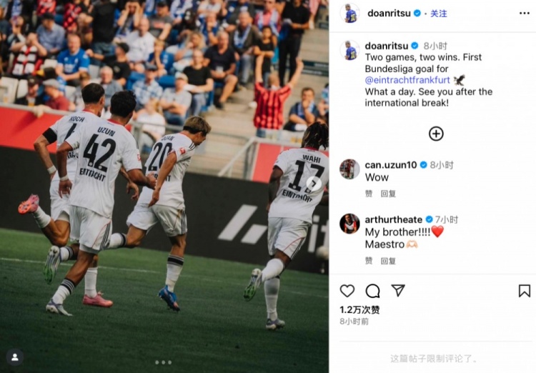 赛后堂安律社媒晒出和队友庆祝照,并配文写道:“两战两胜,而且我收获了法兰克福生涯的德甲首球,多么美妙的一天!国际比赛日后再见!”