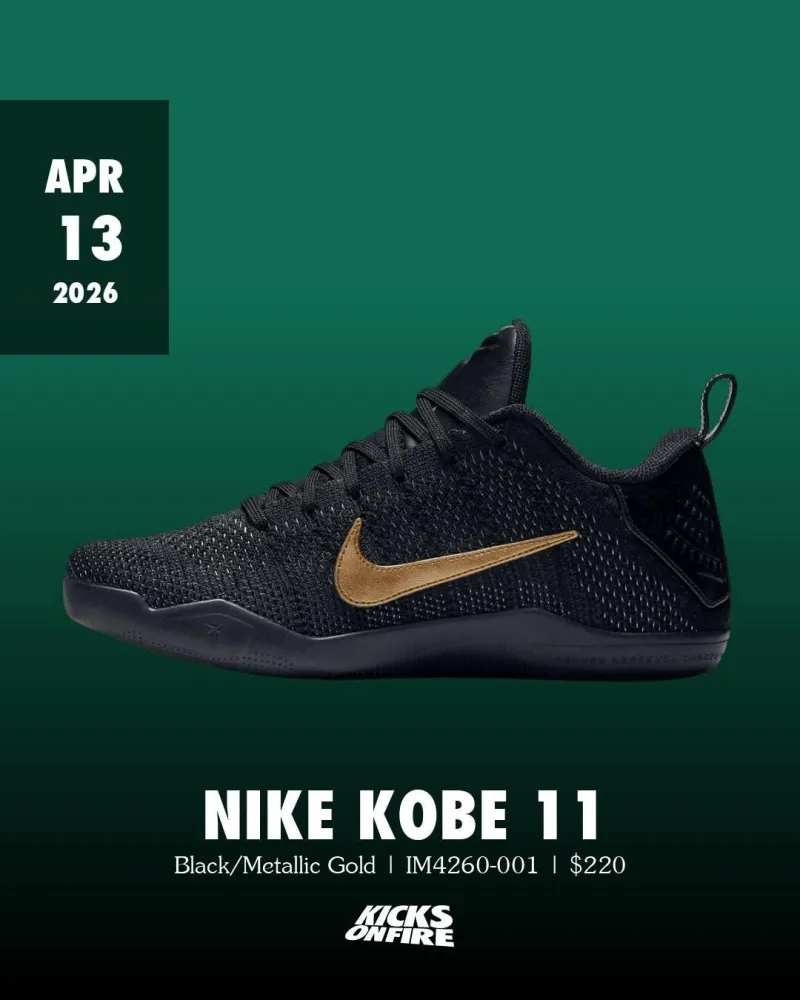 虎扑09月12日讯 黑金色Nike Kobe 11 Elite Protro将于2026年4月13日,也就是科比生涯谢幕战10周年纪念日复刻回归。,货号IM4260-001,发售价220美元(国内预计1599元)。