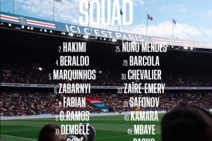 后卫:2-阿什拉夫、4-贝拉尔多、5-马尔基尼奥斯、6-扎巴尔尼、21-卢卡斯-埃尔南德斯、25-努诺-门德斯、43-卡马拉、51-帕乔