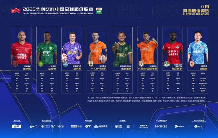 注:因第23轮大连英博海发对阵青岛西海岸比赛延期,故八月月度评选范围为联赛第19、20、21、22轮共计4轮比赛,参选球员数据以上述4轮比赛数据为准。