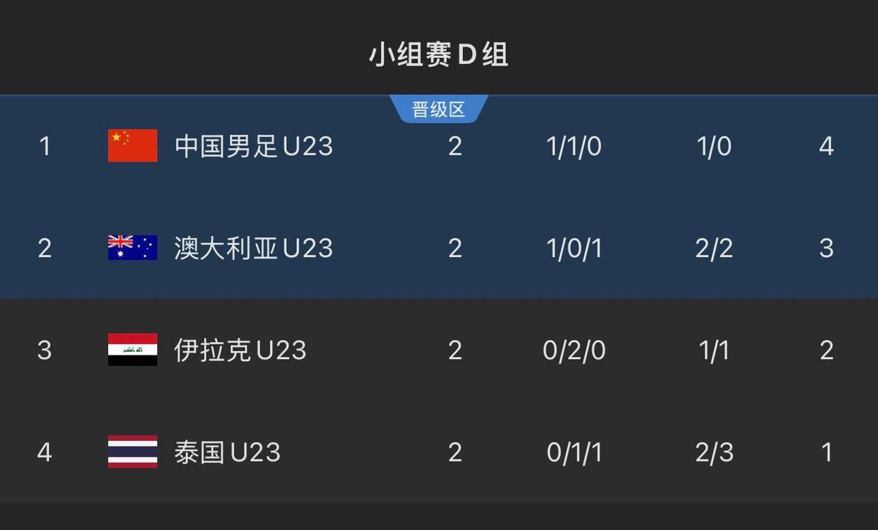 考虑到小组赛最后一场的对手是目前组内垫底的泰国队,因此中国队不仅有着很大的晋级概率,甚至有希望能够以小组头名晋级淘汰赛。从积分形式上来看,主动权完全掌握在国足U23自己手中。最后一场对阵泰国队,只要能够保持不败即可顺利晋级淘汰赛。毕竟中国队第3场只要再拿一分,那么无论澳大利亚队和伊拉克队的战果如何?男足都将锁定小组前二的位置。而如果能够顺利在泰国队身上拿下三分的话,那么男足就将以7分强势锁定小组第一。