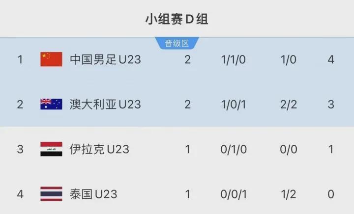 由于本轮1比0战胜澳大利亚队,中国队一胜一平积4分,力压澳大利亚队的3分,暂列小组第一。这也是中国U23历届U23亚洲杯的最高积分。在此前他们单届赛事最多积分仅为3分。