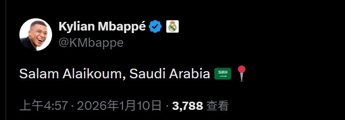 姆巴佩通过社媒发文:“Salam Alaikoum(阿拉伯语‘你好’),沙特阿拉伯”,同时还附上了沙特国旗和定位符号。